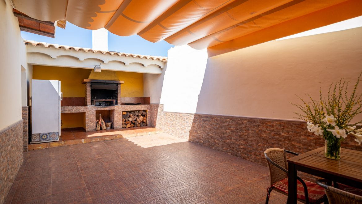 - Patio con toldo, con mesa y sillas para 4 personas, barbacoa con encimera, fregador, iluminación y punto de luz