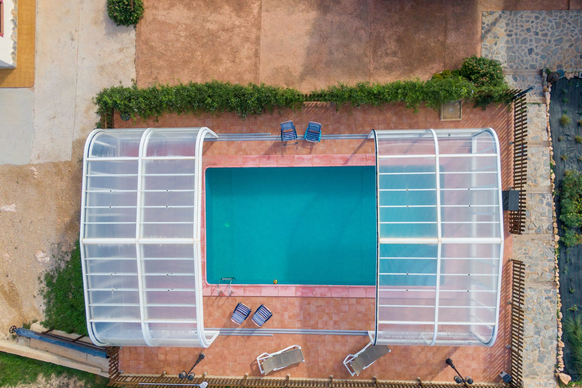 Se puede disfrutar durante todo el año. Tiene una cubierta móvil de más de 2m de altura que produce un efecto invernadero y calienta el agua y el ambiente interior. Además, el agua esta climatizada mediante energía solar y bomba de calor. En verano la cubierta se suele retirar para que la piscina se quede totalmente despejada