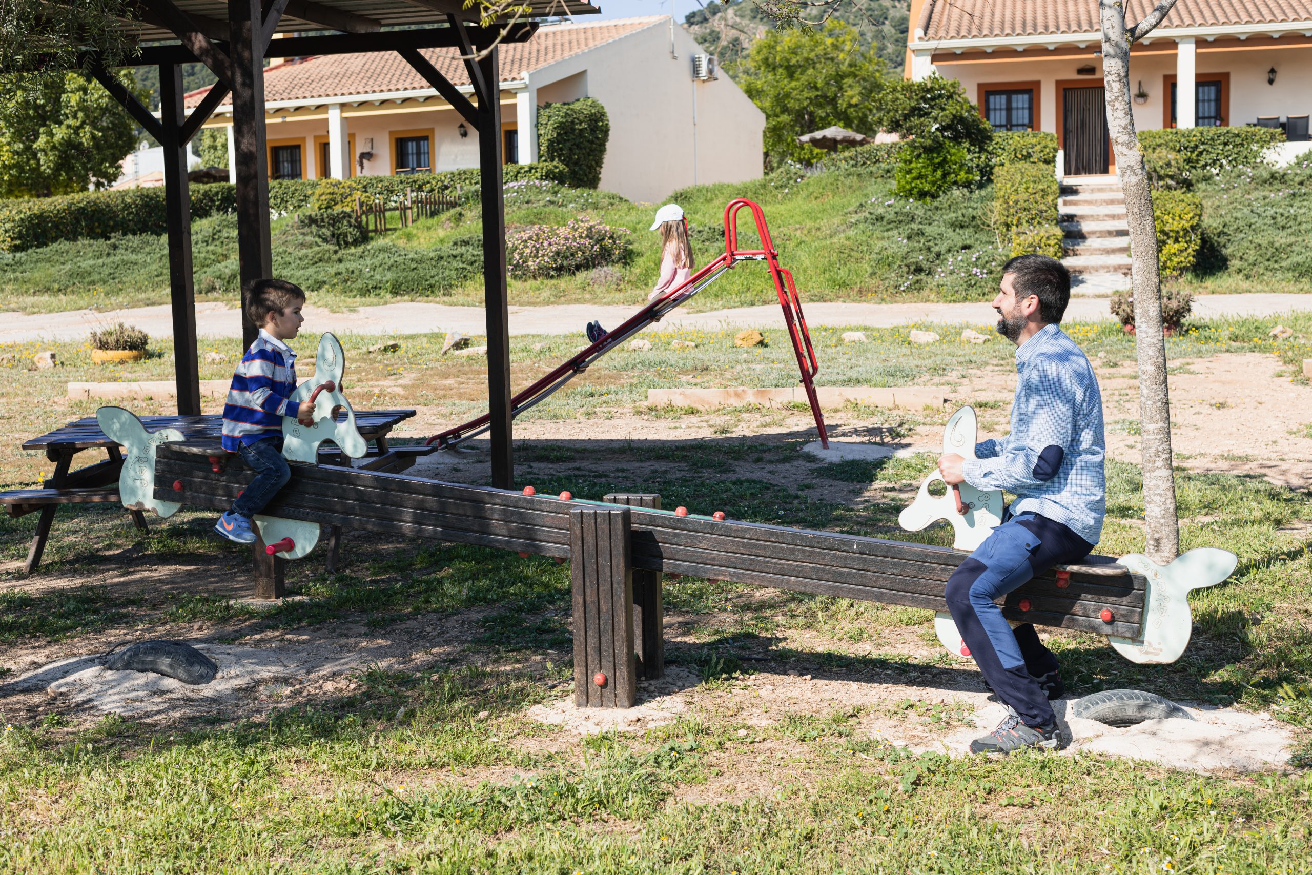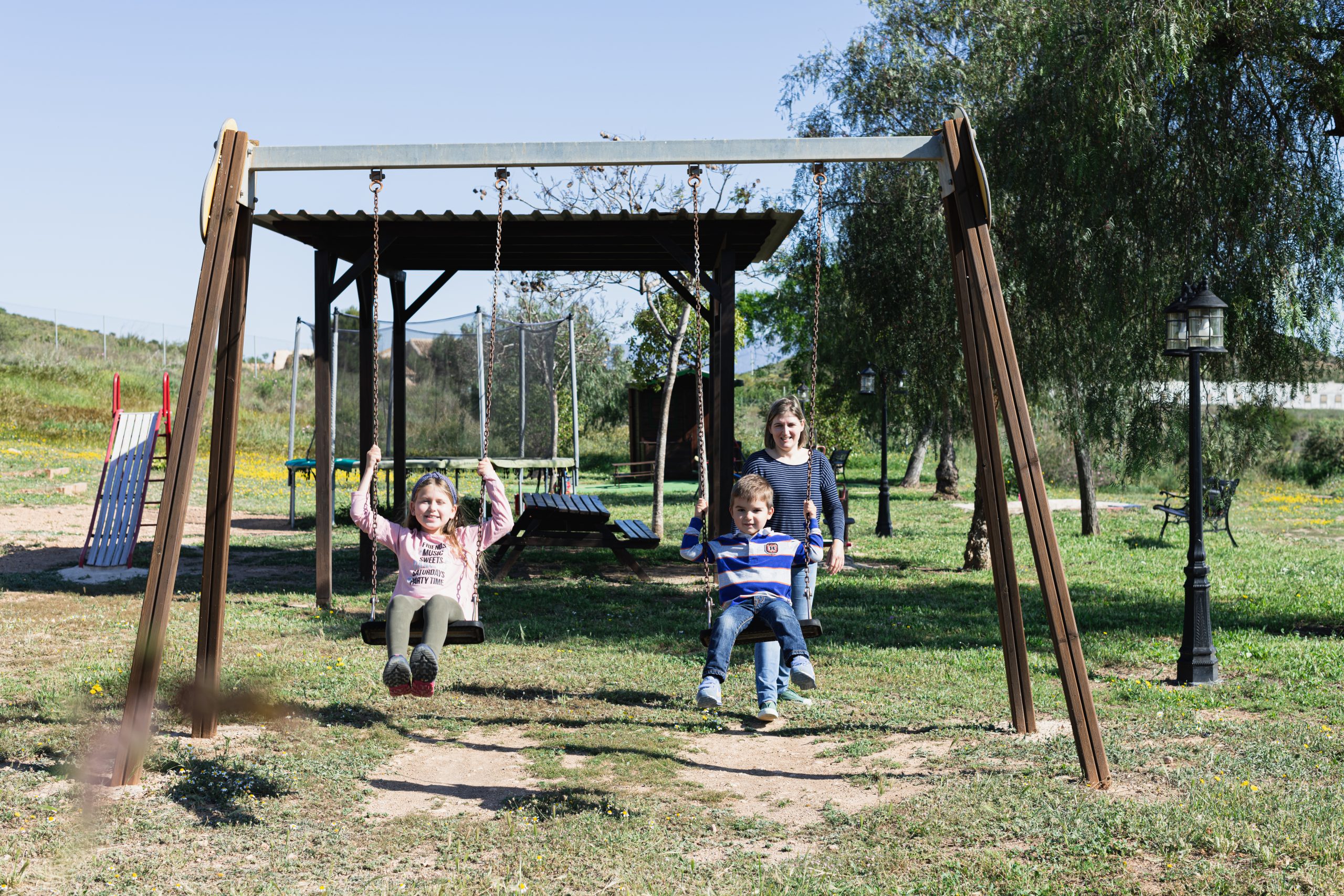 - Zona infantil: Cabaña de madera, columpios, tobogán, arenero y cama elástica.