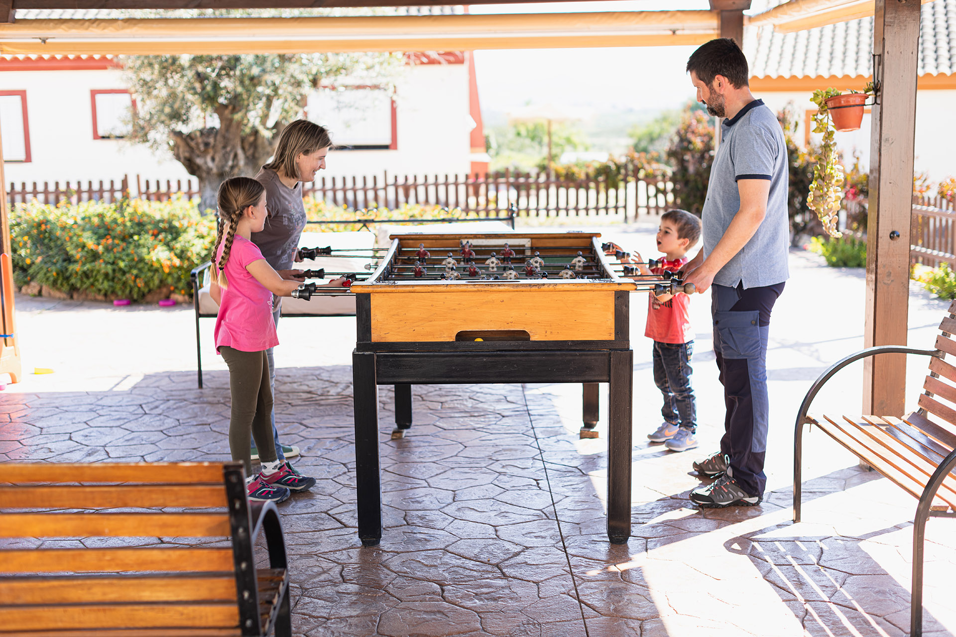Esta zona de juegos está cubierta por una gran pérgola de madera y en ella hay futbolín, tenis de mesa, un Conecta 4 gigante, ajedrez y tres en raya.